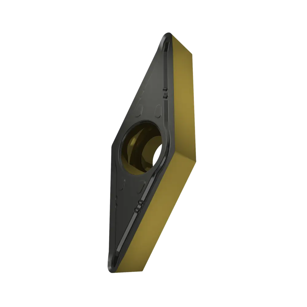 Односторонняя позитивная токарная пластина, ромбовидная 35° с зазором 7°, диаметр вписанной окружности 9,525 мм, толщина 4,76 мм, радиус вершины 0,8 мм, точность индексации в соответствии с классом допуска ISO-M, стружколом UR со скругленными режущими кромками, из сплава T9415, функционально-градуированного твердого сплава WC-Co с покрытием MT-CVD в диапазоне ISO P05 -P30, для чистовой и тяжелой обработки сталей.