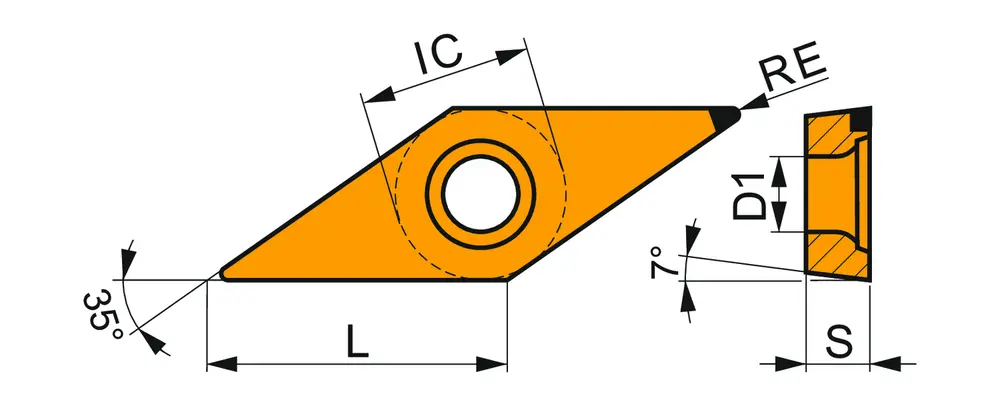 Токарная пластина с вершиной из PCD, ромбовидная 35° с зазором 7° и диаметром вписанной окружности 9,525 мм, толщиной 4,76 мм, радиусом при вершине 0,4 мм, точностью индексации в соответствии с классом допуска ISO-M, острыми режущими кромками, марки PD1, непокрытый поликристаллический алмаз в диапазоне ISO N05 - N25, для высокоскоростной обработки цветных металлов.