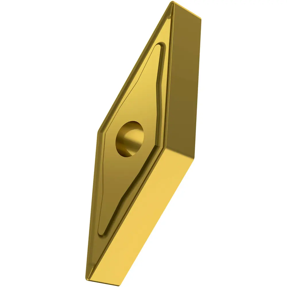 Двусторонняя негативная токарная пластина, ромбовидная 35° с диаметром вписанной окружности 9,525 мм, толщиной 4,76 мм, радиусом при вершине 0,4 мм, точностью индексации в соответствии с классом допуска ISO-M, стружколомом NM со скругленными режущими кромками, из сплава T8315, мелкозернистого твердого сплава WC-Co с покрытием PVD в диапазоне ISO M05 - M20, для чистовой и тяжелой обработки нержавеющих сталей.