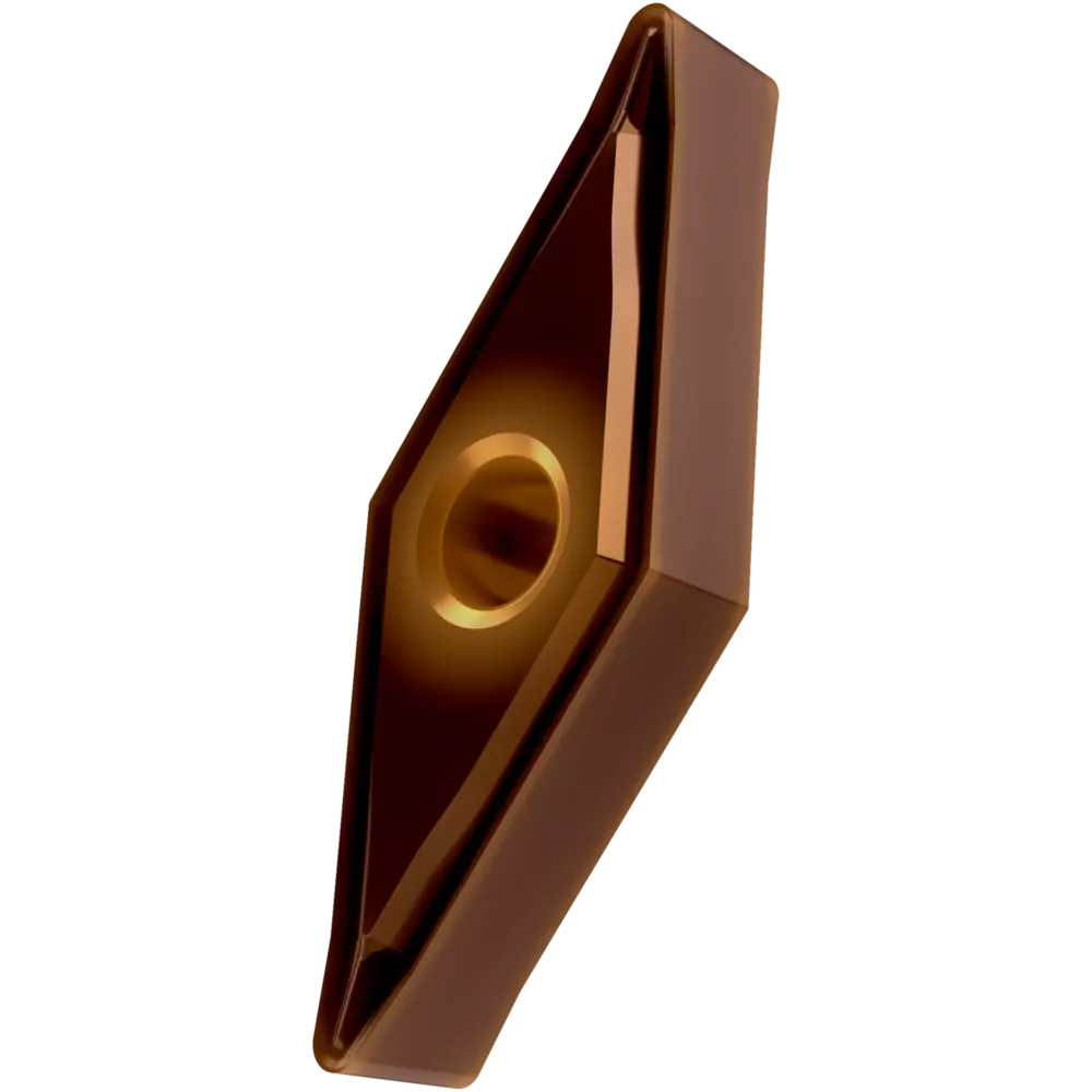 Двусторонняя негативная токарная пластина, ромбовидная 35° с диаметром вписанной окружности 9,525 мм, толщиной 4,76 мм, радиусом при вершине 0,8 мм, точностью индексации в соответствии с классом допуска ISO-M, стружколомом NF со скругленными режущими кромками, из сплава T8430, мелкозернистого твердого сплава WC-Co с покрытием PVD в диапазонах ISO P20 -P40 и M20 -M35, для чистовой и средней обработки сталей и нержавеющих сталей.