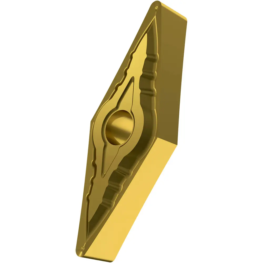 Двусторонняя негативная токарная пластина, ромбовидная 35° с диаметром вписанной окружности 9,525 мм, толщиной 4,76 мм, радиусом при вершине 0,8 мм, точностью индексации в соответствии с классом допуска ISO-M, стружколомом SF со скругленными режущими кромками, из сплава T8315, мелкозернистого твердого сплава WC-Co с покрытием PVD в диапазонах ISO M05 -M20/K05 -K25 и H05 -H15, для чистовой и средней обработки нержавеющих сталей, чугунов и закаленных материалов.