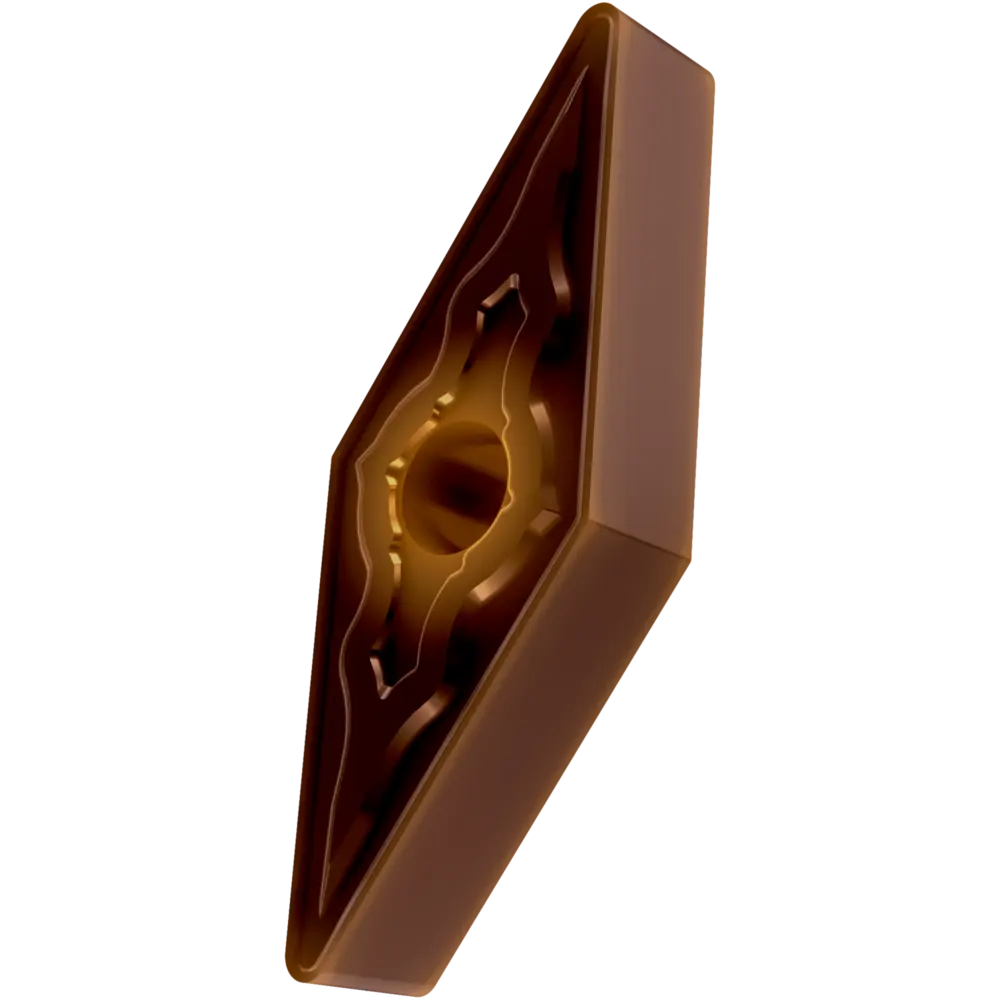 Двусторонняя негативная токарная пластина, ромбовидная 35° с диаметром вписанной окружности 9,525 мм, толщиной 4,76 мм, радиусом при вершине 1,2 мм, точностью индексации в соответствии с классом допуска ISO-M, стружколомом NMR со скругленными режущими кромками, из сплава T8430, мелкозернистого твердого сплава WC-Co с покрытием PVD в диапазонах ISO P20 -P40 и M20 -M35, для чистовой и тяжелой обработки сталей и нержавеющих сталей.