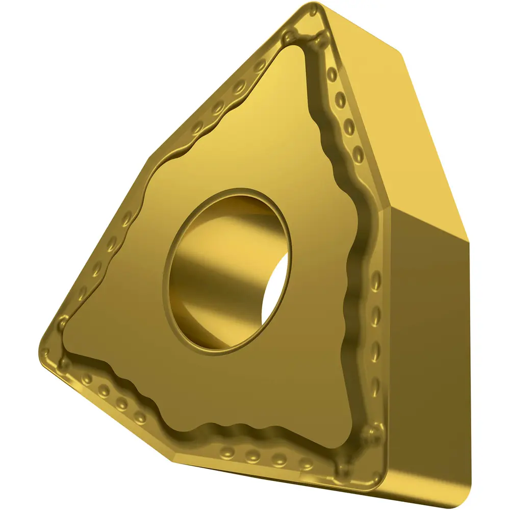 Двусторонняя негативная токарная пластина, 80° тригон с диаметром вписанной окружности 9,525 мм, толщина 4,76 мм, радиус вершины 0,4 мм, точность индексации в соответствии с классом допуска ISO-M, стружколом FF со скругленными режущими кромками, из сплава T8315, мелкозернистый карбид WC-Co с покрытием PVD в диапазоне ISO M05 - M20, для тонкой обработки нержавеющих сталей