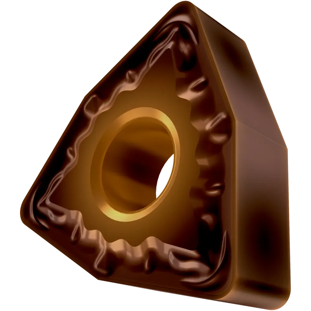 Двусторонняя негативная токарная пластина, треугольная 80° с диаметром вписанной окружности 9,525 мм, толщина 4,76 мм, радиус при вершине 0,4 мм, точность индексации в соответствии с классом допуска ISO-M, стружколом FM со скругленными режущими кромками, из сплава T8415.