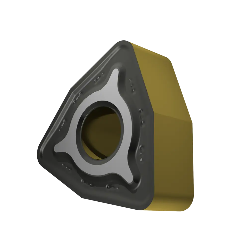 Двусторонняя негативная токарная пластина, 80° тригон с диаметром вписанной окружности 9,525 мм, толщина 4,76 мм, радиус вершины 1,2 мм, точность индексации в соответствии с классом допуска ISO-M, стружколом RM со скругленными режущими кромками, из сплава T9415, функционально-градуированного твердого сплава WC-Co с покрытием MT-CVD в диапазоне ISO P05 -P30, для средней и тяжелой обработки сталей