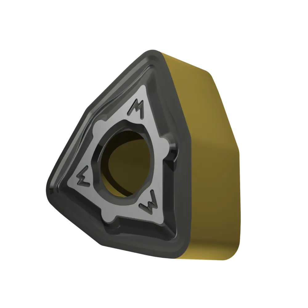 Двусторонняя негативная токарная пластина, 80° тригон с диаметром вписанной окружности 9,525 мм, толщина 4,76 мм, радиус вершины 1,2 мм, точность индексации в соответствии с классом допуска ISO-M, стружколом M с конструкцией кромки WIPER, из сплава T9415, функционально-градуированного твердого сплава WC-Co с покрытием MT-CVD в диапазоне ISO P05 -P30, для чистовой и тяжелой обработки сталей.