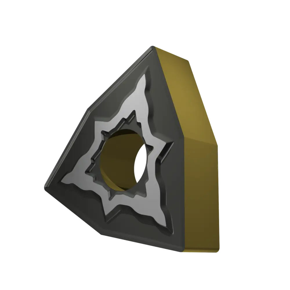Двусторонняя негативная токарная пластина, 80° тригон с диаметром вписанной окружности 12,7 мм, толщина 4,76 мм, радиус вершины 0,4 мм, точность индексации в соответствии с классом допуска ISO-M, стружколом NMR со скругленными режущими кромками, из сплава T9415, функционально-градуированного твердого сплава WC-Co с покрытием MT-CVD в диапазоне ISO P05 -P30, для чистовой и тяжелой обработки сталей