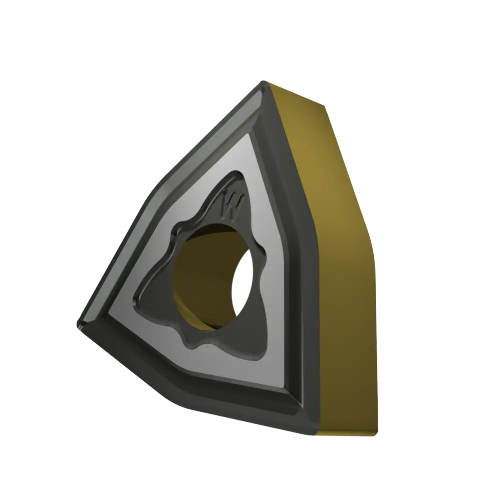 Двусторонняя негативная токарная пластина, 80° тригон с диаметром вписанной окружности 12,7 мм, толщина 4,76 мм, радиус вершины 0,4 мм, точность индексации в соответствии с классом допуска ISO-M, стружколом MR с конструкцией кромки WIPER, из сплава T9415, функционально-градуированного твердого сплава WC-Co с покрытием MT-CVD в диапазоне ISO P05 -P30, для средней и тяжелой обработки сталей