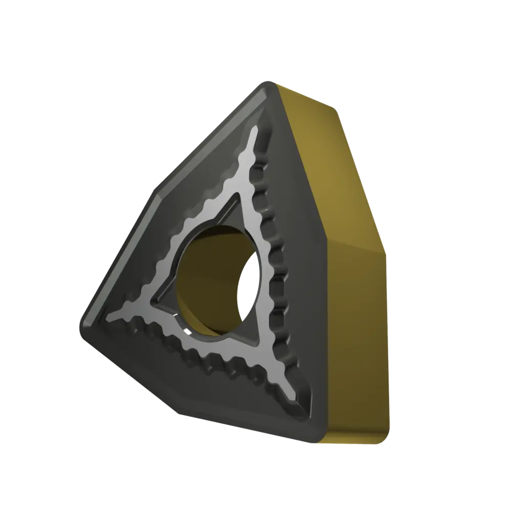 Двусторонняя негативная токарная пластина, 80° тригон с диаметром вписанной окружности 12,7 мм, толщина 4,76 мм, радиус вершины 0,8 мм, точность индексации в соответствии с классом допуска ISO-M, стружколом SM со скругленными режущими кромками, из сплава T9415, функционально-градуированного твердого сплава WC-Co с покрытием MT-CVD в диапазоне ISO P05 -P30, для чистовой и тяжелой обработки сталей