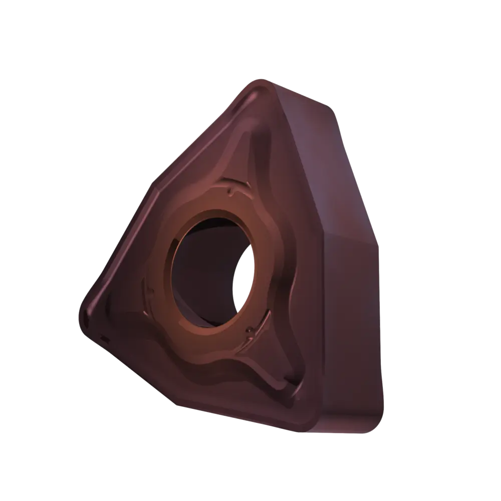 Двусторонняя негативная токарная пластина, 80° тригон с диаметром вписанной окружности 12,7 мм, толщиной 4,76 мм, радиусом при вершине 1,2 мм и точностью индексации в соответствии с классом допуска ISO-M, стружколом NRM, из сплава T8430, мелкозернистого твердого сплава WC-Co с покрытием PVD в диапазонах ISO P20 -P40 и M20 -M35, для средней и тяжелой обработки сталей и нержавеющих сталей.