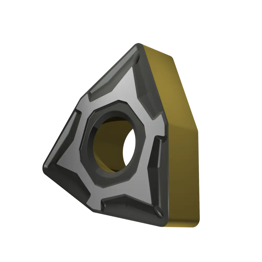 Двусторонняя негативная токарная пластина, 80° тригон с диаметром вписанной окружности 12,7 мм, толщина 4,76 мм, радиус вершины 1,2 мм, точность индексации в соответствии с классом допуска ISO-M, стружколом M со скругленными режущими кромками, из сплава T9415, функционально-градуированного твердого сплава WC-Co с покрытием MT-CVD в диапазоне ISO P05 -P30, для чистовой и тяжелой обработки сталей.