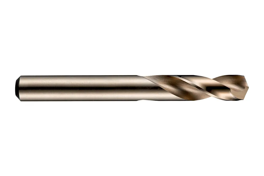 Сверло короткое с прямым хвостовиком, диаметром 3,2 мм, общей длиной 49 мм и длиной канавки 18 мм в соответствии со стандартом DIN 1897 с вершиной, заточенной под углом 135°, из быстрорежущей стали HSS-E на основе кобальта с бронзовым покрытием для сверления отверстий диаметром 2,5xD без вывода сверла в нержавеющей стали и суперсплавах