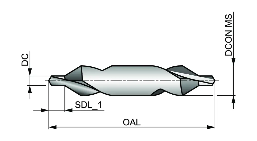 Центровочное сверло (комбинированное сверло и зенковка) с прямым коническим сечением 60°, двухсторонним цилиндрическим корпусом, диаметром сверла 3,00 мм, диаметром корпуса 8,00 мм и общей длиной 50 мм, в соответствии со стандартом Dormer Pramet для изготовления стандартизированных центровых отверстий согласно DIN 332 часть 1 форма A, из быстрорежущей стали с блестящей отделкой для обработки на станке без механического воздействия, обычной углеродистой и легированной стали, а также серого чугуна.